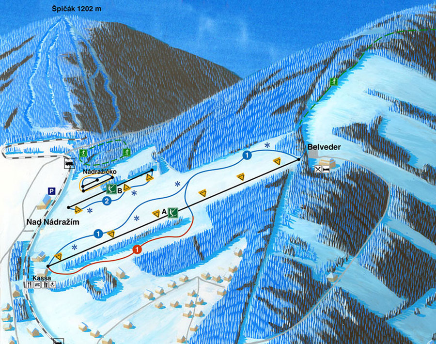 Lyžařské vleky o délce 650 a 300 m jsou umístěny na profilu středně lehkých sjezdovek, které jsou určené pro rodiny s malými dětmi, začínající lyžaře, školní výcvikové kursy a lyžařské školy. Vzhledem k šířce sjezdových tratí zde mohou i zdatnější lyžaři nebo snowboardisté prožít příjemné lyžování v širokém oblouku. Pro úplné začátečníky bez rozdílu věku jsou v „projektu Nádražíčko" připravené dva vleky o délce 100 a 50m, nepohyblivý koberec, terénní nerovnosti a plno barevných překážek. Tento nový projekt je umístěn po pravé straně od nástupní stanice.